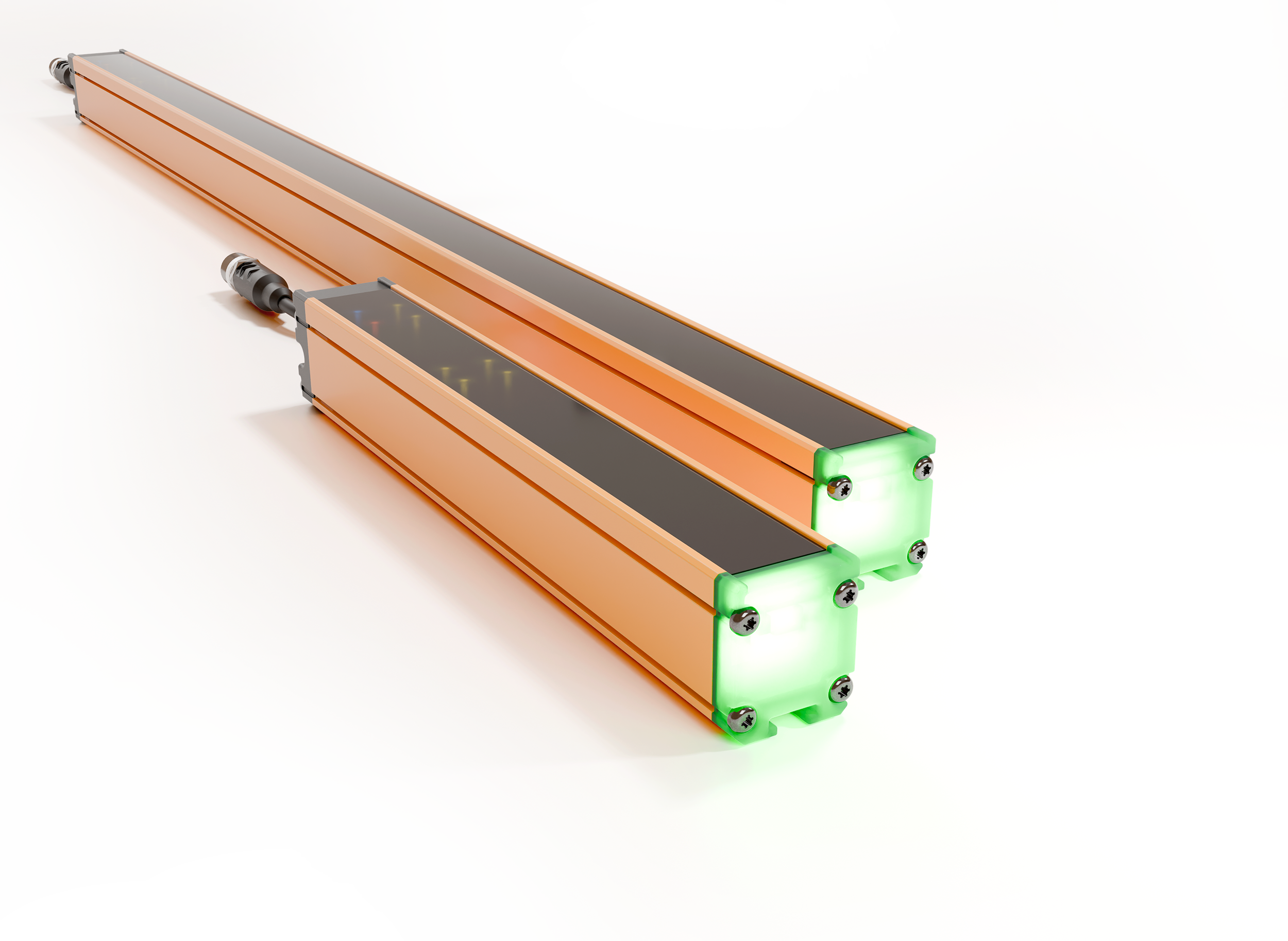 - Zintegrowana lampa statusu: wielokolorowy wskaźnik LED na profilu informuje o stanie pracy (np. naruszenie strefy, oczekiwanie na restart, aktywne maskowanie).